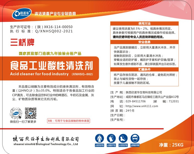 三桥牌食品工业酸性清洗剂(XNHSQ-2型)是以硝酸为主要有效成分的液体清洁剂,有效成份为35%,特别适合用于食品、饮料、乳品、啤酒等行业设备,容器、管道的CIP清洗使用。