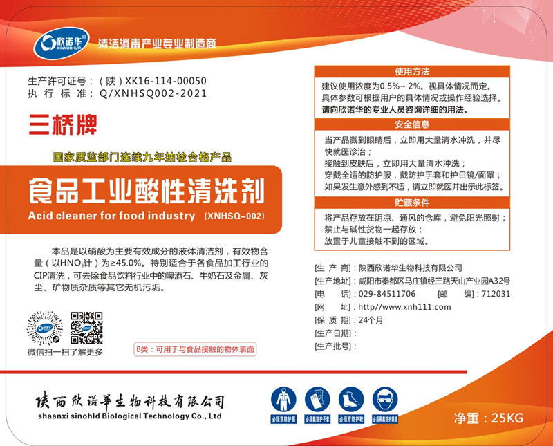 2.三桥牌食品工业酸性清洗剂(XNHSQ-2型)从原材料到包装及整个生产过程均采用食品级标准生产,安全无毒性,对塑料、不锈钢无腐蚀,对橡胶密封件相对温和