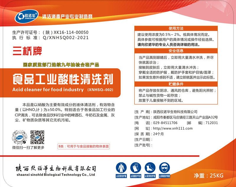 三桥牌食品工业酸性清洗剂(XNHSQ-2型)是以硝酸为主要有效成分的液体清洁剂,有效成份为50%,特别适合用于食品、饮料、乳品、啤酒等行业设备,容器、管道的CIP清洗使用。