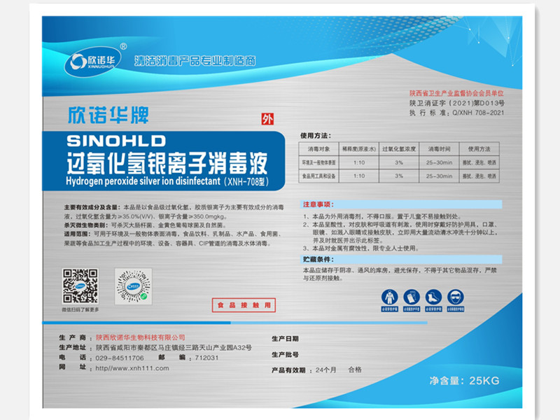 主要成分及含量:本品是以食品级过氧化氢、胶质银离子为主要有效成分的消毒液,过氧化氢含量≥35.0%;银离子含量≥350mg/kg。可杀灭大肠杆菌,金黄色葡萄球菌及自然菌等。