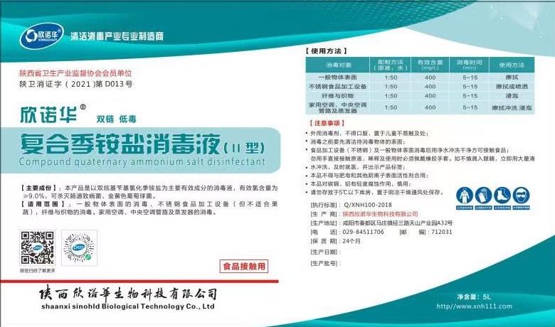 产品简介: 欣诺华牌复合季铵盐消毒液属于第四代双链季铵盐消毒液,具有无色,无明显气味,中性,对呼吸道和皮肤无刺激,清洁消毒同时完成,保质期长,运输不受管制,使用方便的特点,本品为中效消毒剂,允许应用于食品,医疗,家庭等行业的消毒。