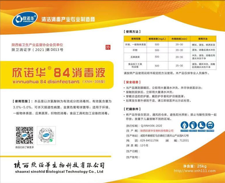陕西欣诺华生物科技有限公司是卫健委批准的专业生产消毒产品的企业,主要产品有:欣诺华牌84消毒液,欣诺华牌过氧化氢消毒液,欣诺华牌含氯泡腾消毒片,欣诺华牌75%酒精消毒液,欣诺华牌二氧化氯消毒剂,欣诺华牌含氯消毒粉,欣诺华牌免洗手消毒液,欣诺华牌免洗手消毒凝胶等产品的专业厂家,消毒产品卫生许可证号: 陕卫消证字(2021)第D号013号,客户可放心使用。